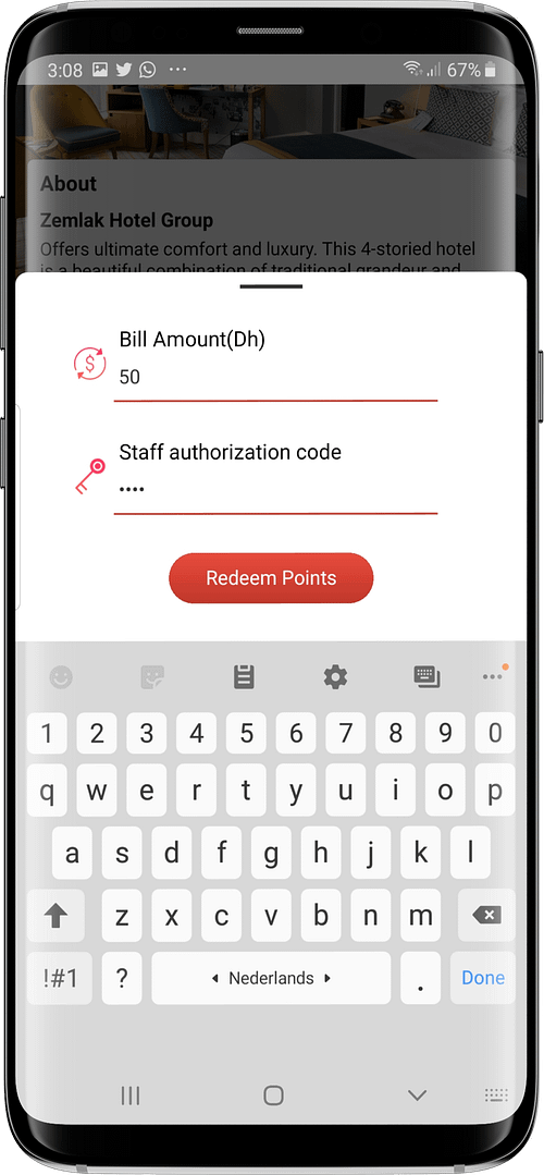 When the customer returns he opens the app, a staff member types in the bill amount, the receipt number, and an authorization code. The bill is then reduced accordingly and the rewards redeemed.