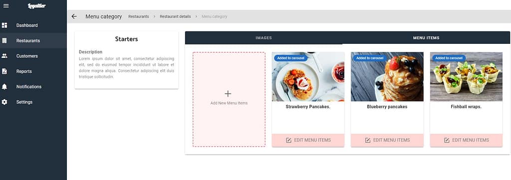 Enter menu items one by one with an image for each menu item along with the price and a description. You can also display a copy of the entire menu.