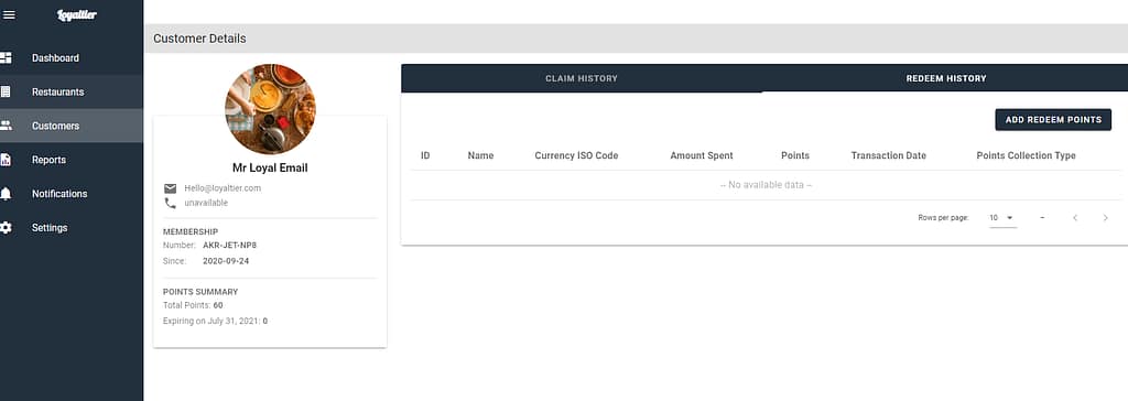 For each customer you can see the detail of all the collection and redemption transactions and you can also manually Claim and Redeem points – which could come in useful if a customer’s phone is out of battery charge or perhaps you want to give out bonus points as rewards.