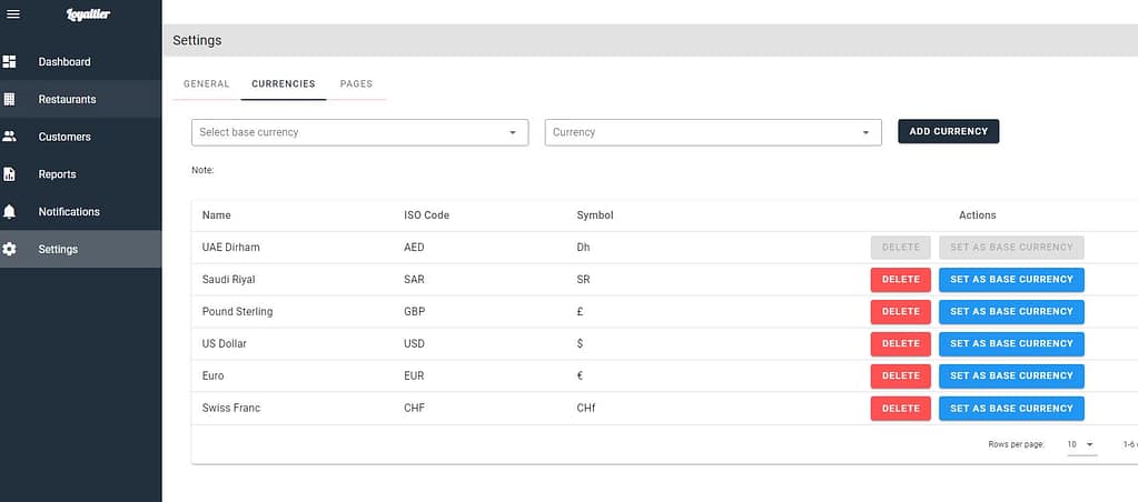 If you have restaurant properties in different currency areas you can set up the relevant currencies here. Note that points will be collected as per the points collection ratio and the amounts spent in terms of the base currency.
