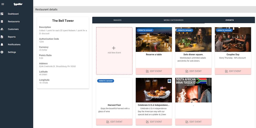 Enter description and images for the restaurant. As well as location, currency, point ratio and authorization code.