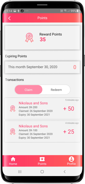Users can check their points balance, and points collection and redemption history, along with the amount spent, and the restaurant where the points were collected or redeemed
