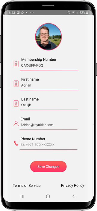 Someone can become a loyalty program member simply by registering through the app, either by logging in with Facebook, Gmail or with an email address. When first signing in a membership number is created. This information is accessible through the Profile Screen in the app where details can be changed as well. The logo shown at the signup page will be your own and the background image as well.