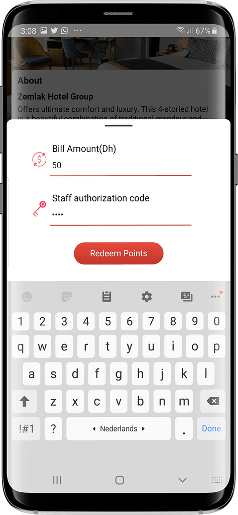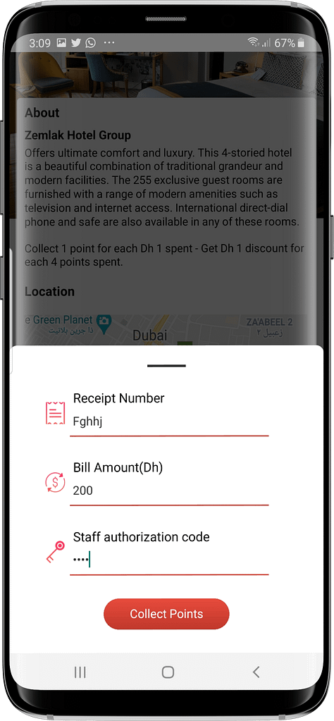 On the restaurant screen, the loyalty program member can Collect Points and Redeem Points by handing the phone to the waiter. The amount of points collected depends on the spending/points ratio you have set for the hotel in question when paying the bill. Just click the relevant button. The staff member should then enter the bill amount and an authorization code. Optionally also a receipt number can be entered when points are collected to have an audit trail for the transactions which is accessible through the web frontend that we provide.